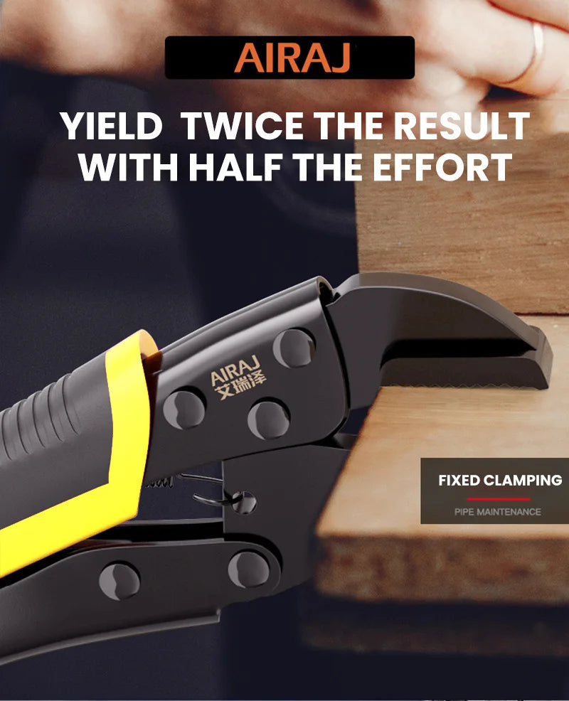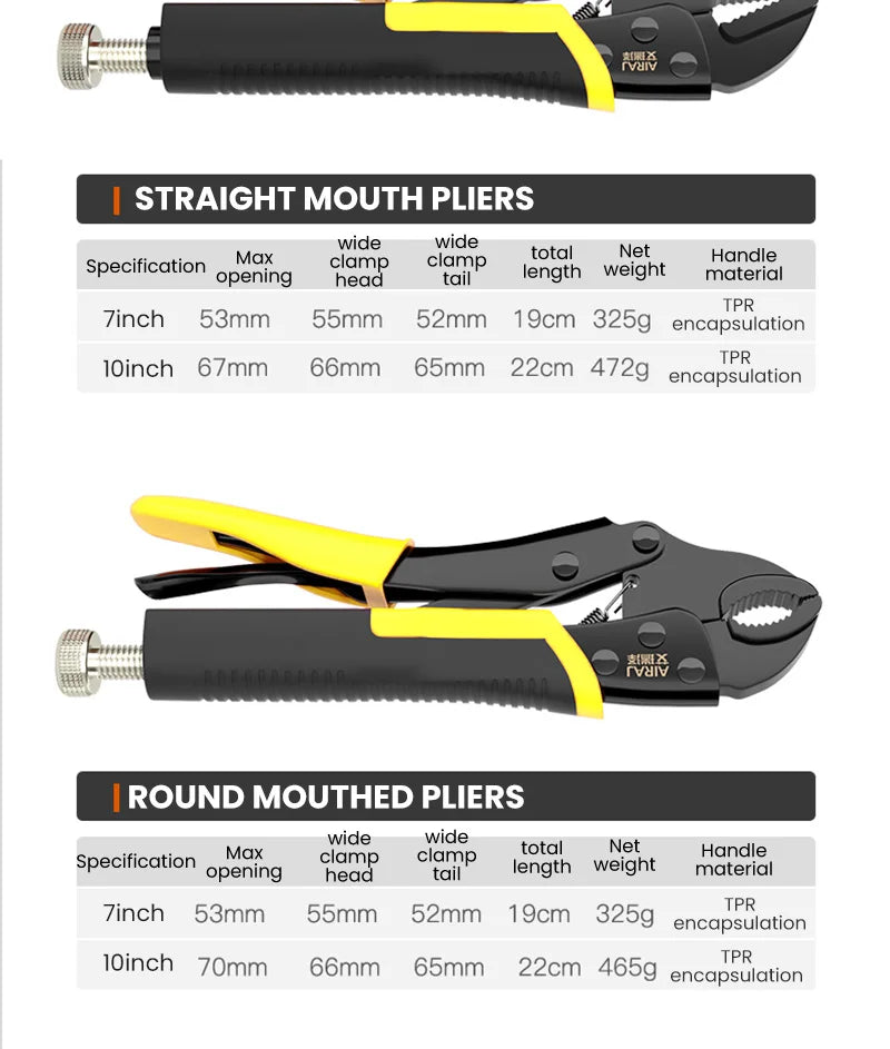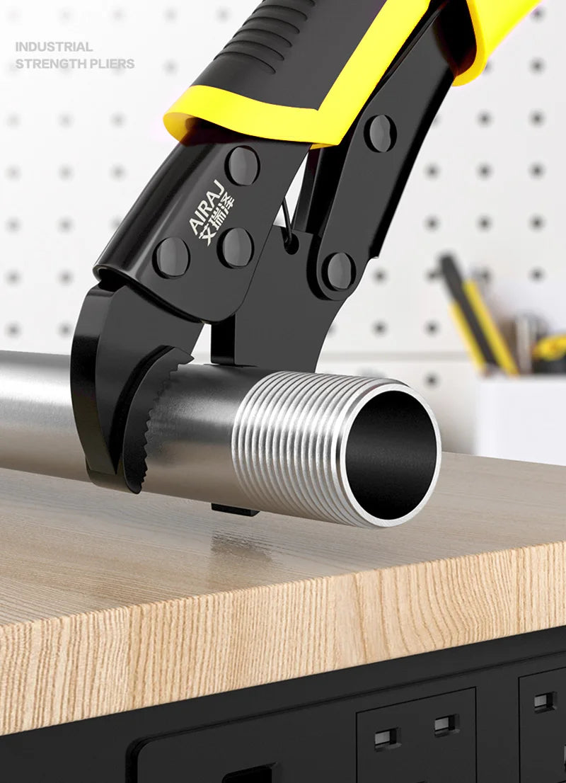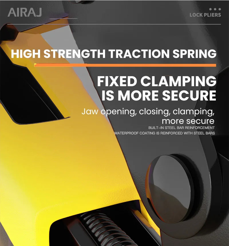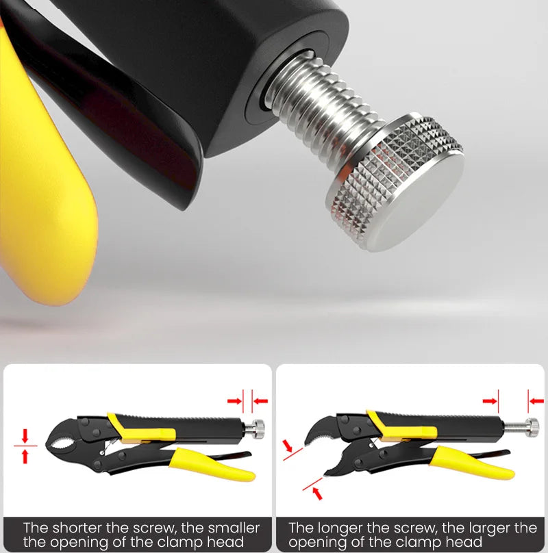 Achieve secure grips and fast adjustments with the AIRAJ 5 Piece Locking Pliers Set featuring a quick-release curved mouth.