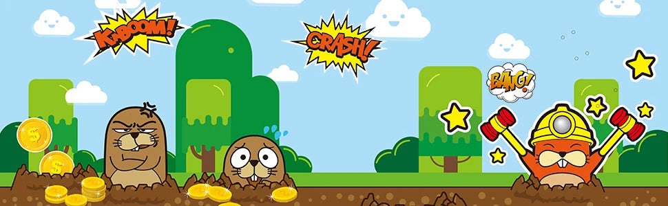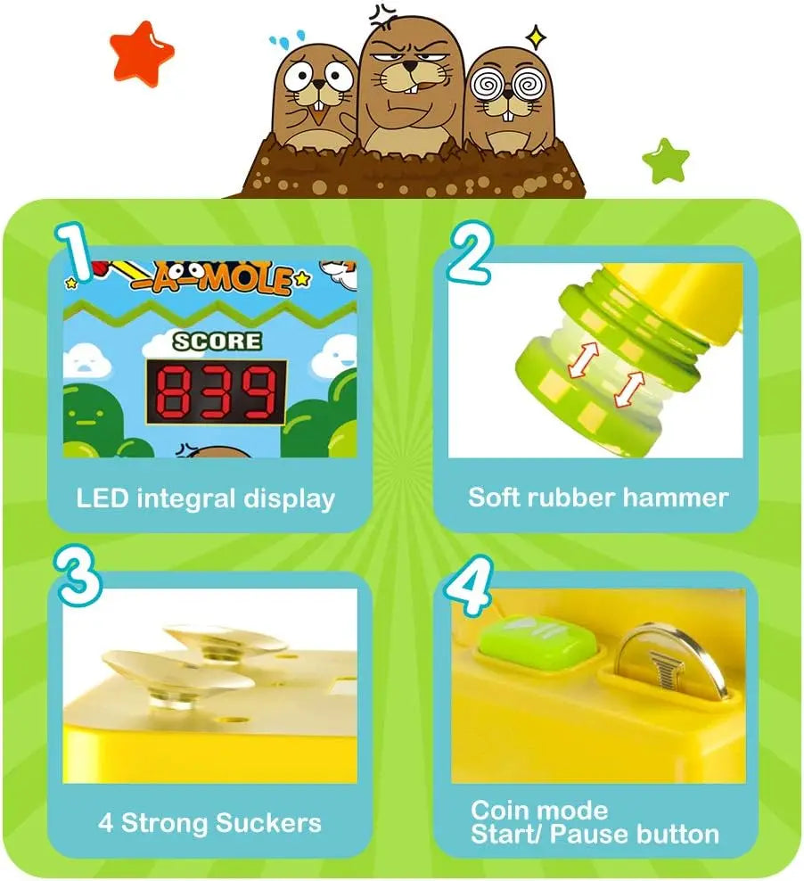 - Boost hand-eye coordination and fine motor skills as you tap lighted moles with two soft hammers, designed for kids aged 4–6 years.